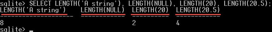 SELECT LENGTH('A string'), LENGTH(NULL), LENGTH(20), LENGTH(20.5);
