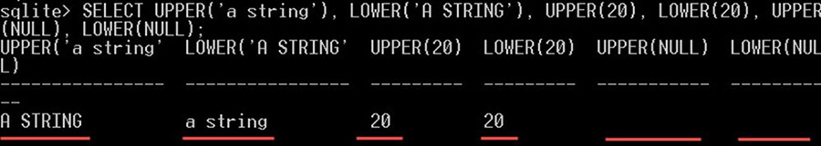 LOWER(X) دقیقاً همان رشته ورودی X را بازگشت میدهد، اما این بار همه حروف آن به صورت حروف کوچک انگلیسی هستند. UPPER(X) دقیقاً همان رشته ورودی X را بازگشت میدهد، اما این بار همه حروف آن به صورت حروف بزرگ انگلیسی هستند. در صورتی که یک مقدار تهی به این دو تابع ارسال شود، LOWER و UPPER مقدار تهی بازگشت میدهند.