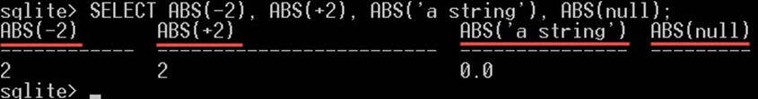 SELECT ABS(-2), ABS(+2), ABS('a string'), ABS(null);