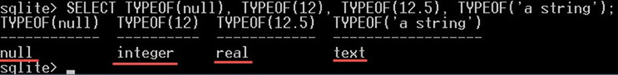 SELECT TYPEOF(null), TYPEOF(12), TYPEOF(12.5), TYPEOF('a string');