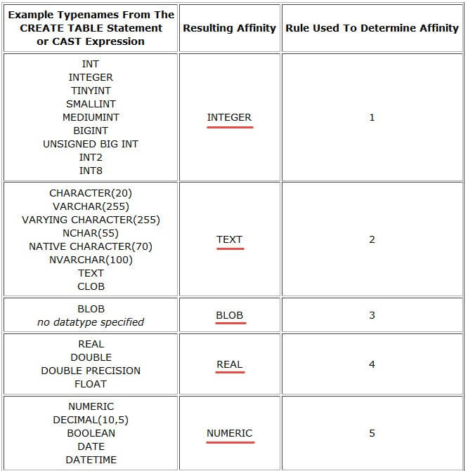 - SQLite یک روش مؤثر برای ذخیرهسازی دادهها ارائه میکند، چون در آن طول ستونها متغیر بوده و ثابت نیست. از این رو SQLite تنها فضایی که نیاز دارد را تخصیص میدهد. برای نمونه اگر یک ستون varchar(200) داشته باشید، و یک مقدار با طول 10 کاراکتر در آن قرار دهید، varchar(200) تنها فضای 20 کاراکتر را برای آن فیلد اختصاص میدهد و دیگر 200 کاراکتر اشغال نمیکند.