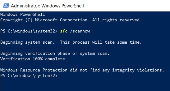 اگر کلیک چپ موس کار نمیکند، احتمالا مشکل به خود ویندوز برمیگردد. برای تست کردن این مرد باید روی منوی استارت راست کلیک کنید و سپس PowerShell را انتخاب کنید. حال باید System File Checker tool را اجرا کنید. عبارت sfc /scannow را بنویسید و Enter را بزنید. یکی از سه گزینه زیر نمایش داده خواهد شد: