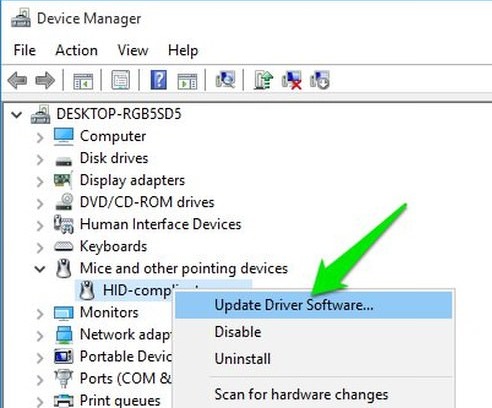 برای رفع مشکل کلیک چپ موس Windows + R را بگیرید. در باکس devmgmt.msc را وارد کنید. Device Manager باز خواهد شد. به Mice and other pointing devices بروید. دکمه فلش به سمت راست کیبورد را فشار دهید تا منو باز شود. سپس روی HID-compliant mouse راست کلیک کنید. حال روی Update driver software کلیک کنید.