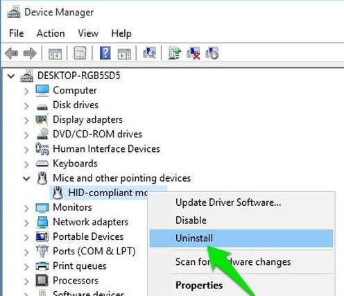 این گونه ویندوز درایور را به صورت خودکار آپدیت خواهد کرد. اگر مشکل حل نشد، دوباره روی HID-compliant mouse در Device Manager راست کلیک کنید و Uninstall را انتخاب کنید.