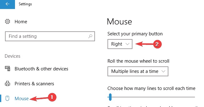 در ابتدا Settings app را باز کنید. سپس به بخش Devices بروید. بعد از آن Mouse را از منوی سمت چپ انتخاب کنید. اکنون دکمه اصلی خود را Right انتخاب کنید.