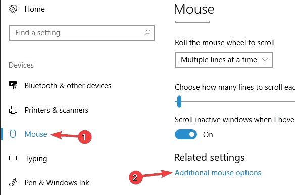 از منوی سمت چپ Mouse را انتخاب کرده و روی Additional mouse options کلیک کنید.