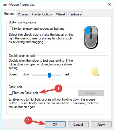 اکنون پنجره Properties Mouse ظاهر می شود. اطمینان حاصل کنید که ویژگی ClickLock فعال نیست. اگر چنین است، تیک گزینه ClickLock را بردارید و برای ذخیره تغییرات، روی Apply و OK کلیک کنید.