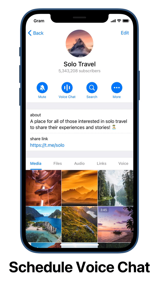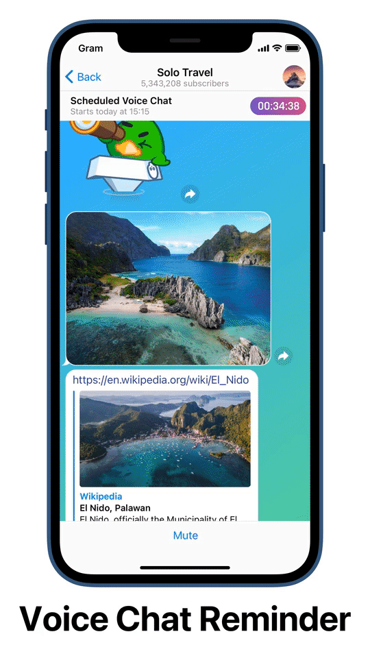 تلگرام میزبان قابلیت شمارش معکوس نیز شده است تا در نقش یادآور برای چت صوتیِ زمانبندیشده ظاهر شود. زمانیکه شمارش معکوس به صفر برسد، چت صوتی لزوما آغاز نمیشود؛ چون میزبان حتما باید گزینهی Start را انتخاب کند. وقتی در چت صوتی حضور داشتید، میتوانید با ضربهزدن روی تامبنیل کاربران به «مینی پروفایل» آنها دسترسی پیدا کنید. مینی پروفایل شامل تصاویر و بخشهای دیگر است.