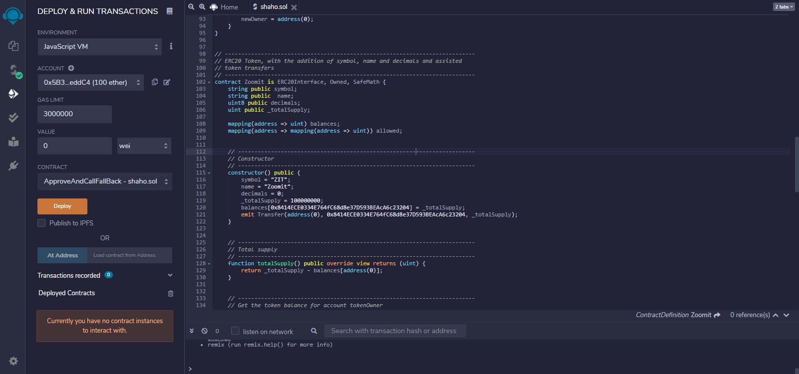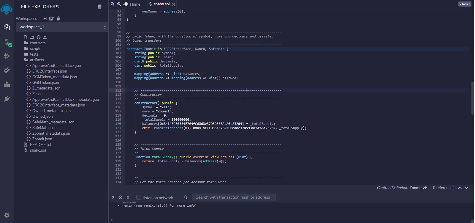 - در خط ۴ (رنگ آبی)، عنوان قرارداد هوشمند را تغییر دهید. در اینجا، ZoomitToken وارد شده است.