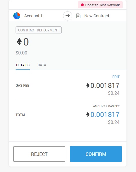 پس از زدن Deploy، متامسک از شما درباره خرج مقداری اتر آزمایشی و تأیید تراکنش سؤال خواهد کرد که مطابق تصویر زیر است.