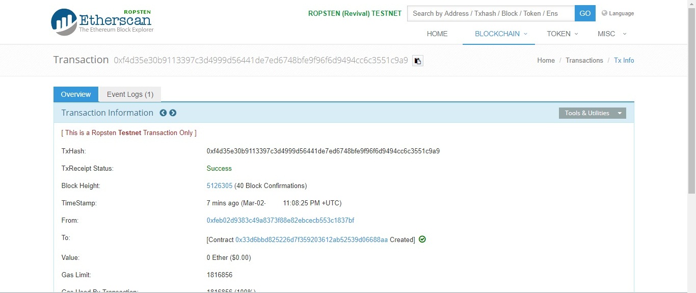 به آدرس بالای تراکنش و در قسمت Transaction توجه کنید. این همان آدرس قرارداد هوشمندتان است.