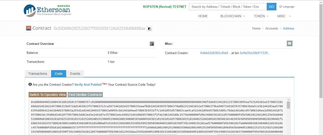 روی آدرس قراردادتان کلیک و تب Code را باز کنید.