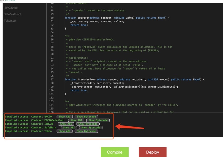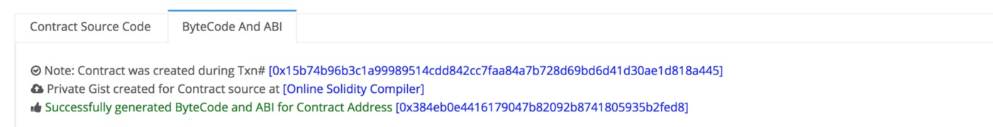 دوباره از مطابقت نسخه کامپایلر با خط اول کد مطمئن شوید و سپس روی «تأیید و انتشار» کلیک کنید. درصورت موفقیت، ByteCode و ABI همانند تصویر زیر ایجاد خواهد شد.