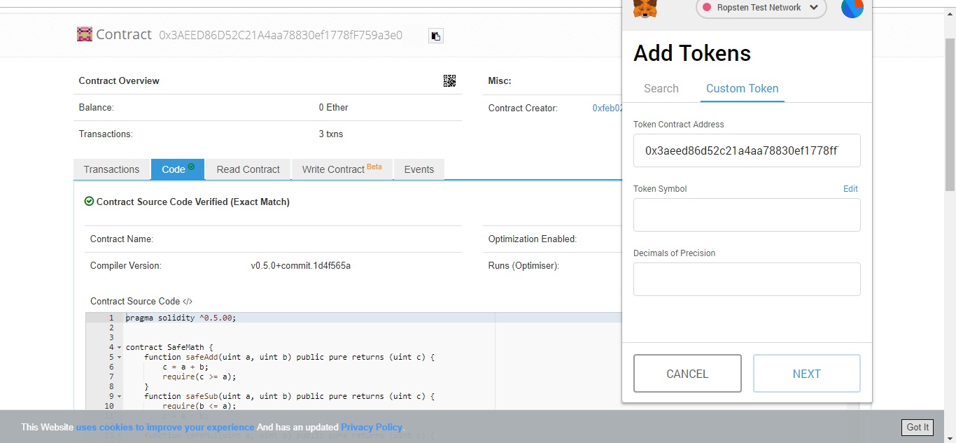 حال اگر توکنتان تأیید شده باشد، مقدار اولیه توکنهای ایجادشده (در اینجا ۱۰۰۰۰ توکن) را میتوانید دریافت کنید. همانند تصویر زیر آدرس قرارداد را کپی و در قسمت متامسک > Add Token < Custom token پیست کنید.