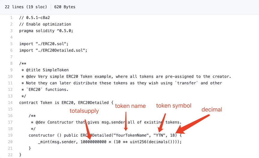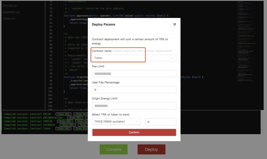 ۳. کد قرارداد هوشمند مبتنیبر TRC20 خود را آماده کنید. از این لینک میتوانید به کدی نمونه دسترسی داشته باشید. از لینک ذکرشده فایل Token.sol را ویرایش کنید و مقادیر token name ،token symbol ،precisoin و totalsupply را تغییر دهید. منظور از precision همان decimals در بخشهای قبلی است.