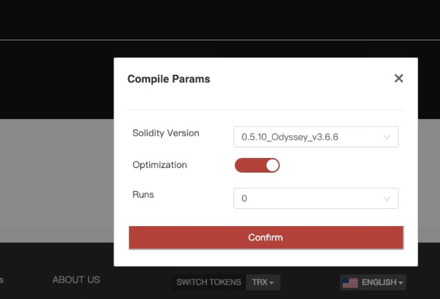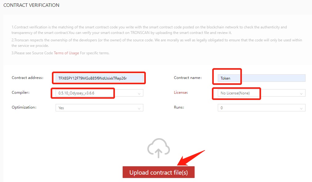 ۶. قرارداد هوشمند TRC20 خود را ازطریق Tronacan (این لینک) تأیید کنید. اطلاعات قرارداد هوشمند شامل آدرس قرارداد، نام قرارداد، نسخه کامپایلر، لایننس، تاریخچه بهینهسازی و دفعات اجرا (Runs) را وارد کنید: