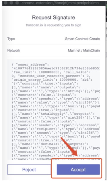 در پنجره بازشده، صدور توکن را باید تأیید کنید. پس از زدن تأیید، ترونلینک از شما امضا درخواست میکند. قبول را بزنید و پیام را امضا کنید.