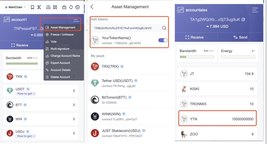 ۵. توکنهای ساختهشده خود را به کیفپول دیجیتال Tronlink اضافه کنید. ازطریق صفحه Asset Management، آدرس قرارداد یادداشتشده در مرحله قبل را در باکس Add tokens وارد کنید. پس از واردکردن توکن در add token box، پنجره قرارداد اعمالشده باز میشود. دکمه کشویی را فشار دهید تا توکن به والت ترونلینک اضافه شود. بعد از اضافهکردن توکن، میتوان انتقال را انجام داد.