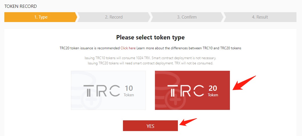 ۷. با استفاده از Tronacan و ابزار ثبت، توکن TRC20 خود را ثبت کنید (از این لینک). پس از بازکردن لینک، در صفحهنمایشدادهشده نوع توکن را انتخاب کنید.