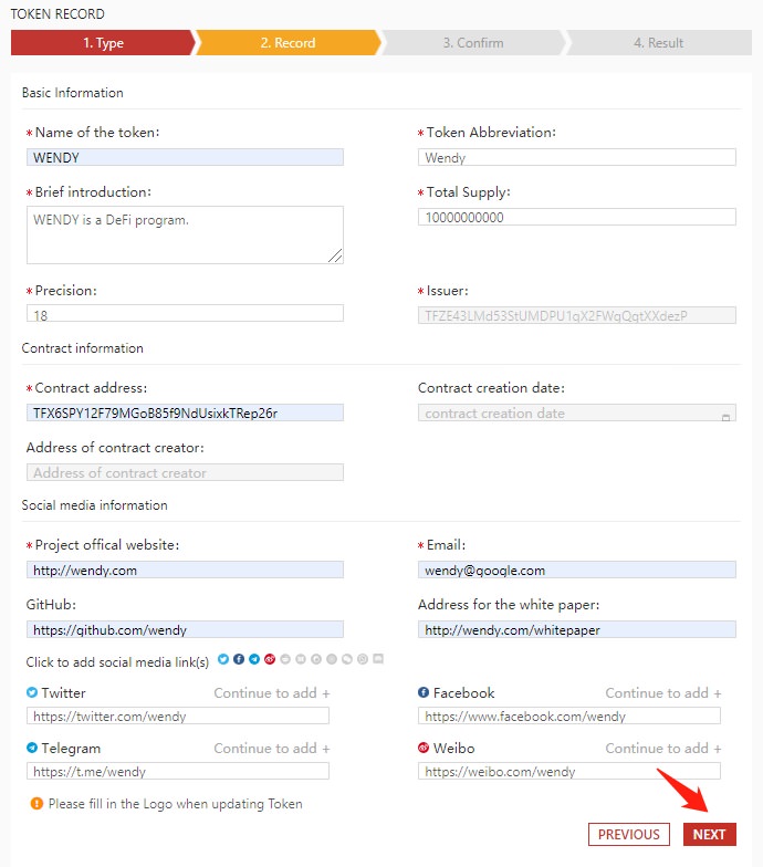 درادامه، TRC20 و سپس Yes را انتخاب و سپس اطلاعات پایهای، اطلاعات قرارداد، اطلاعات رسانه اجتماعی توکن را وارد کنید. پرکردن فیلدهای ستارهدار ضروری است. در فیلد Issuer، باید امضای دیجیتالتان را وارد کنید. توجه کنید قبلا باید وارد وبسایت شده باشید.