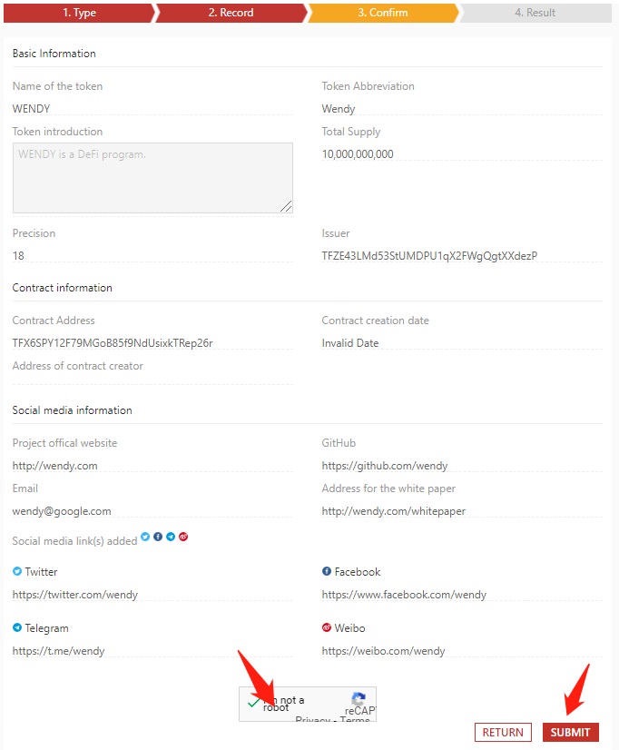 اطلاعات توکن را تأیید کنید و Submit را بزنید.