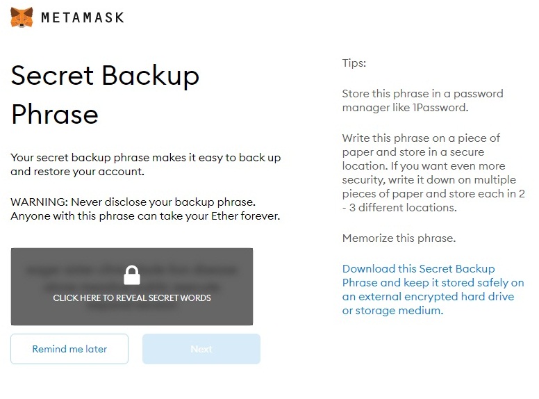 همانگونه که در تصویر بالا مشاهده میکنید با کلیک روی تصویر قفل، ۱۲ کلمه برایتان نمایش داده میشود. این همان عبارات بازیابی ذکر شده است.