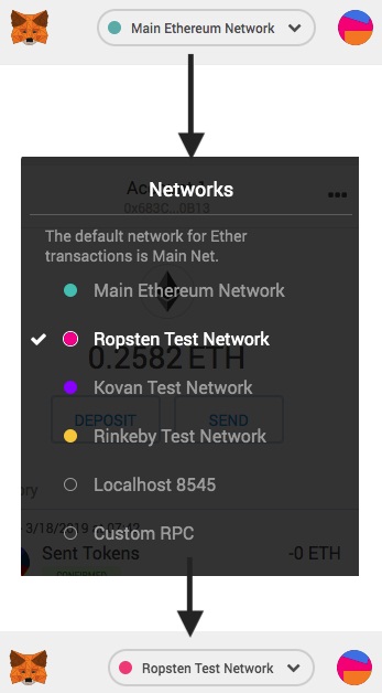 شبکه والت را از شبکه اصلی اتریوم به شبکه آزمایشی Ropsten تغییر دهید. این کار کمک میکند بدون پرداخت کارمزد و بهطور آزمایشی توکنتان را بسازید. دقت کنید در آینده حتما شبکه را به حالت Main Ethereum Network بازگردانید.