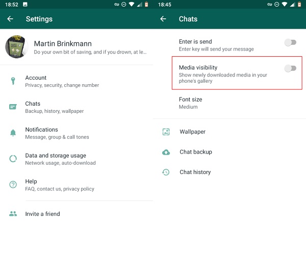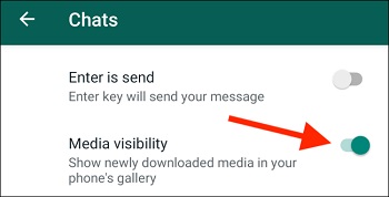 اگر میخواهید که دانلود خودکار انجام شود اما دادهها در گالری ذخیره نشوند، به Settings و سپس Chat بروید. علامت کنار Media Visibility را روشن کنید تا فایلها ذخیره شوند اما در گالری سیو نشوند.