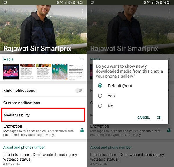 نحوه جلوگیری از نمایش عکس و فیلم برای یک چت یا گروه خاص در واتساپ