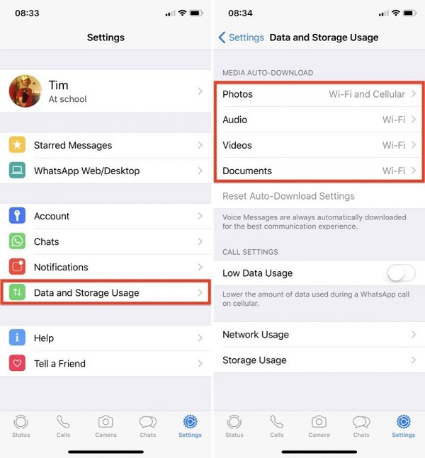 برای عدم ذخیره فیلم واتساپ در گالری در آیفون، میتوانید دانلودهای این برنامه را محدود کنید. با توجه به این که تصاویر و فیلمهای واتساپ به صورت خودکار دانلود میشوند، زمانی که از اینترنت دیتا استفاده میکنید، حجم زیادی از نت را هدر میدهند. شما میتوانید دانلود تصاویر و فیلمهای واتساپ را به وای فای محدود کنید. یعنی تنها زمانی این موارد به صورت خودکار دانلود خواهند شد که شما گوشی را به وای فای وصل کنید.