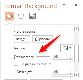 همانطور که میبینید در حالت عادی عکس با میزان شفافیت ۱۰۰ درصد اجرا میشود که در اکثر موارد باعث میشود اسلاید شما دیگر خوانا نباشد، به همین خاطر شما باید گزینهی Transparency را کاهش دهید تا میزانی که بهترین نمایش را برایتان به همراه داشته باشد.