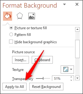 اگر میخواهید این عکس در تمامی اسلایدها با همین تنظیمات اعمال شود، گزینهی Apply To All زیرمجموعه Format Background را انتخاب نمایید.