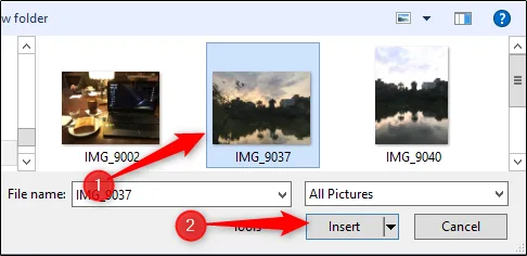 در این حالت شما عکس را از روی دستگاه آدرس میدهید و این کار بعد از کلیک به وسیله File Explorer در ویندوز یا Finder در مک انجام میشود. کافی است آدرس عکس خود را پیدا کرده و روی آن دبل کلیک کنید یا این که عکس را انتخاب نمایید و سپس روی Insert کلیک کنید.