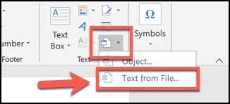 حالا باید گزینهی Object را در این لیست انتخاب کنید. بسته به نسخهی ورد، ممکن است آیکون آن کمی متفاوت با چیزی که در عکس میبینید باشد، برای اطمینان وقتی موس را روی آیکون نگه دارید، عنوان Object به نمایش در میآید. روی فلش کنار آن کلیک کرده و در منوی باز شوند، Text from File را انتخاب نمایید.