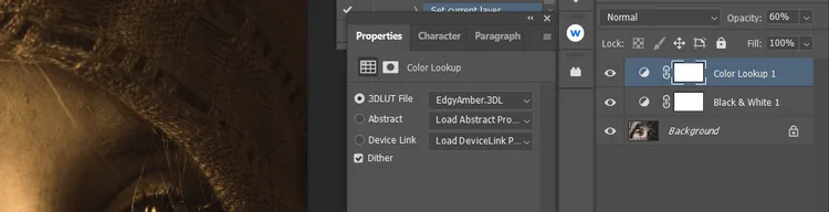 وقتی هنوز Color Lookup 1 سلکت شده، opacity را تا 60 درصد کاهش دهید.