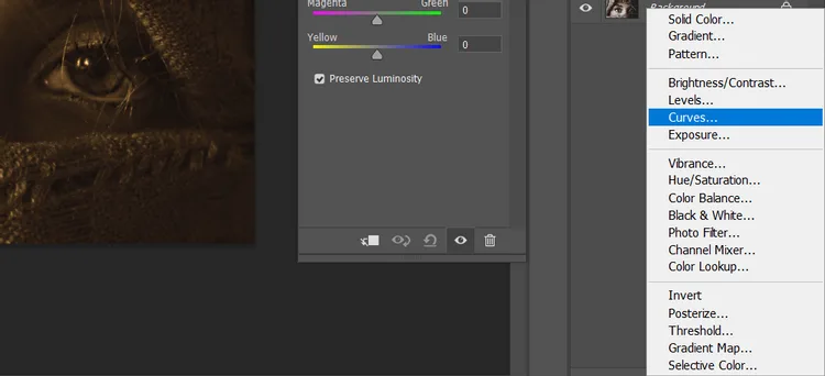 دوباره برای ساخت یک لایه Adjustment Layer اقدام کرده و روی Curves کلیک کنید.