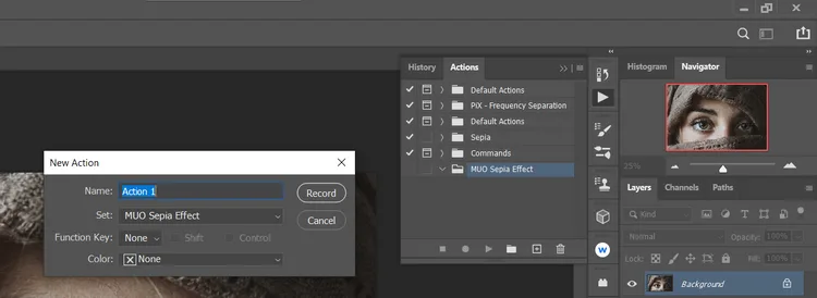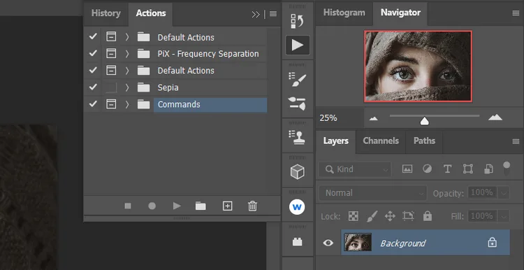 قبل از هر چیز باید فتوشاپ را باز کرده و عکسی که مد نظر دارید را در آن باز کنید. بعد از این کار، کلیدهای Alt + F9 را با هم فشار دهید تا منو Actions برایتان نمایش داده شود.