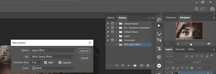 اسم مد نظر خود را برای اکشن انتخاب کرده و سپس کلید شیفت یا کنترل را نگه داشته، روی Record کلیک کنید.