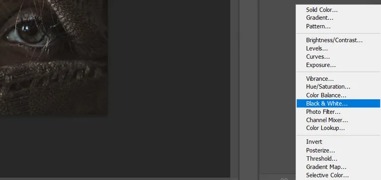 حالا روی آیکون ساخت Adjustment Layer کلیک کرده و گزینهی Black & White را انتخاب کنید. این آیکون در پنل لایهها قرار دارد.