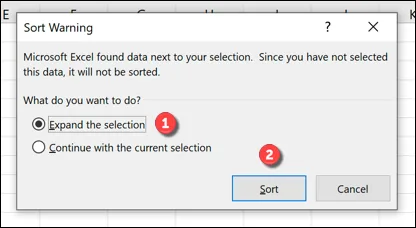 مایکروسافت به شما اخطار میدهد که با انجام این کار تنها ردیفهای یک ستون تغییر میکند، به همین دلیل شما میتوانید با زدن روی Expand The Selection و Sort این تغییر را در کل اسپردشیت انجام دهید یا این که با انتخاب گزینهی دیگر، تنها همان ستون تغییر کند.