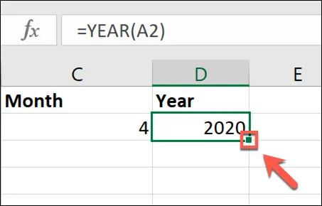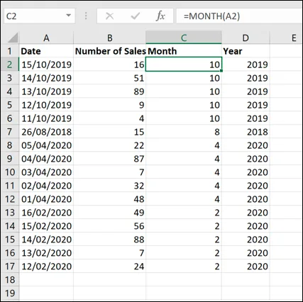 برای انجام این کار میتوانید از تابع MONTH یا YEAR استفاده کنید. به این ترتیب شما میتوانید ماه یا سالی که میخواهید را در اطلاعات خود جدا کنید. ابتدا اولین سلول در اولین ستون و اولین سطر را انتخاب میکنید و سپس گزینهی =MONTH(A2) یا =YEAR(A2) را در محل قید شده، تایپ میکنید. A2 اولین سلول اسپردشیت شماست که در آن تاریخ قید شده است.