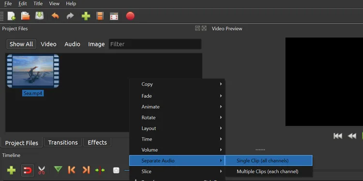 حالا روی ویدیو در تایم لاین کلیک راست کنید، از Separate Audio گزینهی Single Clip (all channels). را انتخاب نمایید. حالا میتوانید با پاک کردن بخش صوتی ویدیو در تایم لاین، ویدیو را بی صدا کنید. سپس از مسیر File > Export Project > Export Video از پروژه خروجی بگیرید.