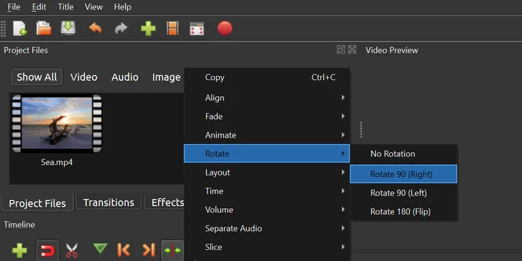 چرخاندن تصویر نیز خیلی ساده بوده و شما میتوانید با کلیک راست روی ویدیو خود در تایم لاین و رفتن به منو Rotate گزینه مورد نظرتان را انتخاب کنید.