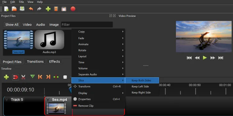 برای این که بتوانید ویدیو را به چند تکه تقسیم کنید و آن بخشهایی که نمیخواهید را حذف کنید، باید روی ویدیو تایم لاین کلیک کرده و به جایی بروید که میخواهید تقسیم انجام شود. سپس به منو Slice رفته و روی Keep Both Sides کلیک کنید. حالا میتوانید بخش هایی که نمیخواهید را حذف کنید و قسمتهای مختلف را به هم بچسبانید تا زمان خالی وسط کلیپها باقی نماند.