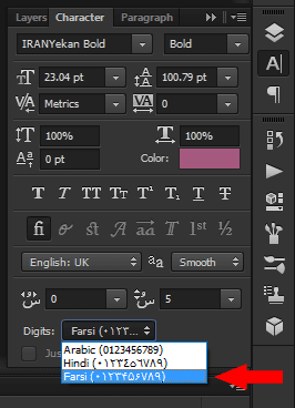 از منو ویندوز یا نوار پنلها Type Character را باز کنید. در قسمت پایین این پنل Digits را پیدا کنید و آن را روی فارسی تنظیم کنید.