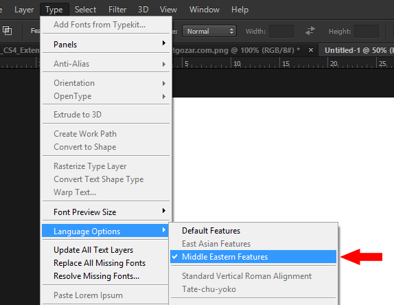 1-2 حال از منو تایپ Language Option را انتخاب و سپس middle eastern features را فعال کنید.