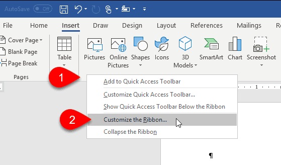 برای تکرار متن در ورد و AutoText میتوانید میانبری ایجاد کنید. برای این کار نوار راست کلیک کنید و Customize the Ribbon را انتخاب کنید.
