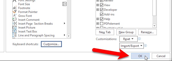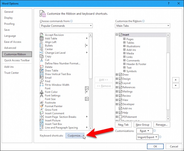 حال در پنجره Word Options روی Customize Ribbon بزنید. سپس Customize کنار Keyboard shortcuts کلیک کنید.