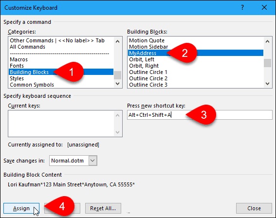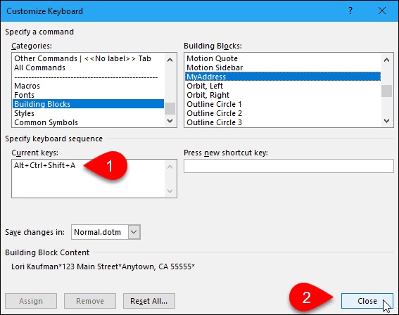 در پنجره Customize Keyboard و از بخش Categories، گزینه Building Blocks را انتخاب کنید. سپس ورودی AutoText موردنظر خود را از کادر Building Blocks انتخاب کنید. روی کادر Press new shortcut key بزنید و کلیدهای میانبر موردنظر خود را برای تایپ کلمات تکراری در ورد وارد کنید. سپس Assign را بزنید.