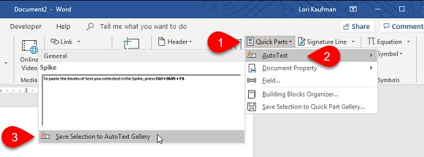 شما میتوانید متن ورودی قابلیت شناسایی کلمات تکراری در ورد و AutoText را تغییر دهید. ابتدا متن جدید را بنویسید. سپس همه متن را انتخاب کنید و علامت پاراگراف را برای آن فعال کنید. از سربرگ Insert روی Quick Parts (در بخش Text) کلیک کنید. حال روی AutoText بروید و Save Selection to AutoText Gallery را انتخاب کنید.